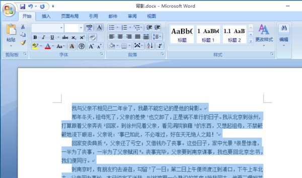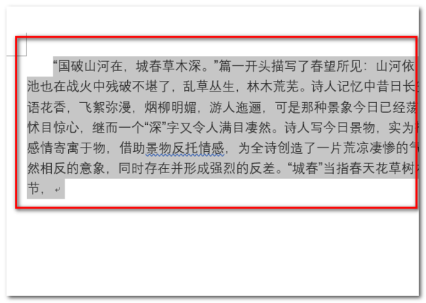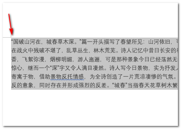 2、可以看到这段文字进行了“首行缩进”的格式,用鼠标左键框选住整段文字。