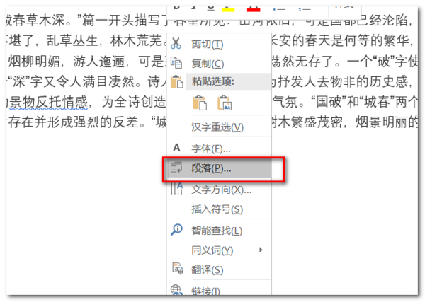 3、在文字上右击,在弹出的快捷菜单中点击“段落”。