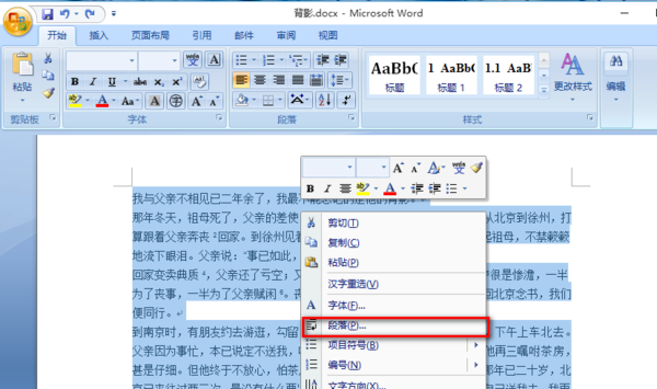 2、选中你的文档,右击,选择“段落”