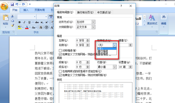 5、下拉特殊格式选择首行缩进。