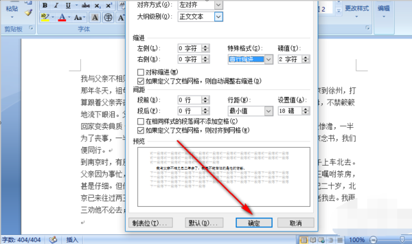 4、点击“确定”,我们的文档就已经缩进了2个字符