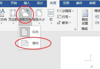 3、在“布局”选项中点击“纸张方向”中的“横向”即可将页面更改为横向显示。