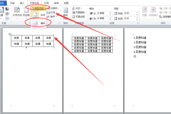 1、将光标定位在第三页首行前面,页面布局——“页面设置”右下角功能扩展箭头——纸张方向:横向,应用于:插入点之后——确定,这时插入点后的所有页面都变成横向了。