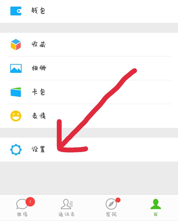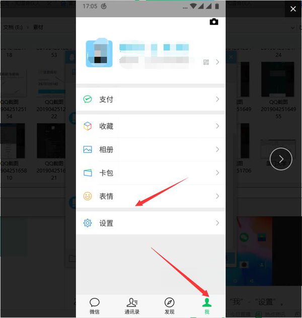 2、接下来在微信页面中选择红色箭头所指处的“我”-“设置”。