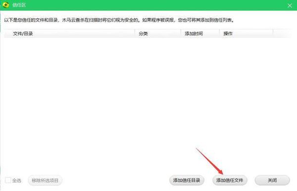点击打开信任区,可以在它的界面中看到它的右下角有一个添加文件夹和添加文件,我们就可以选择需要添加的文件。