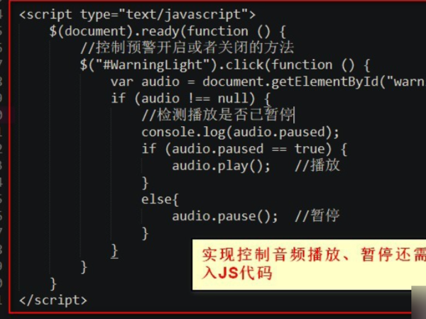2、实现控制音频播放、暂停还需要加入JS代码如下。