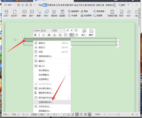 3、接下来选择需要填充颜色的表格,然后单击鼠标右键,选择红色箭头所指处的“边框和底纹”。