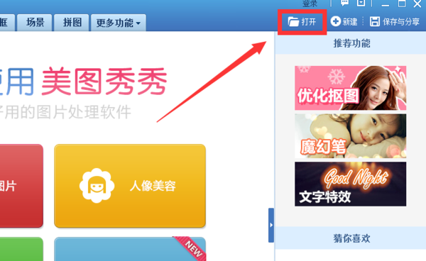 1.首先下载美图秀秀APP,然后打开美图秀秀,点击【打开】。
