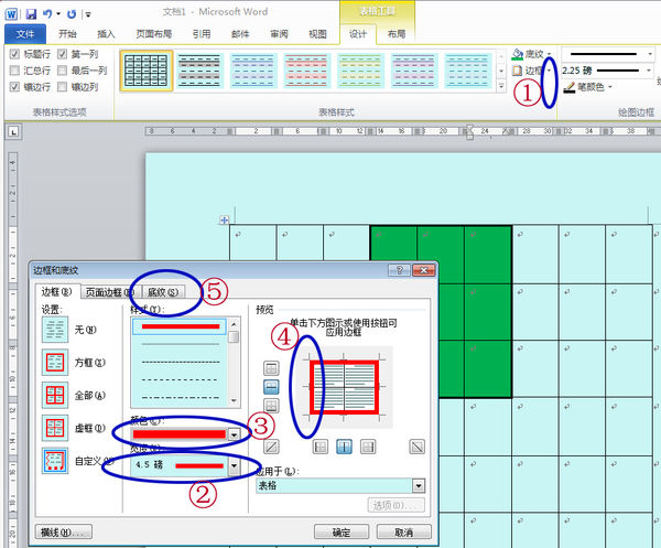 6. 点击“底纹”标签,如附图⑤,设置合适的底纹颜色。确定。