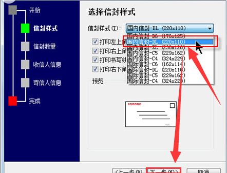3、在“选择信封样式”页面中,选择一种与实际信封尺寸相一致的信封样式,如“国内信封-DL(220×110)”,其他选项保留默认值,继续单击【下一步】按钮。