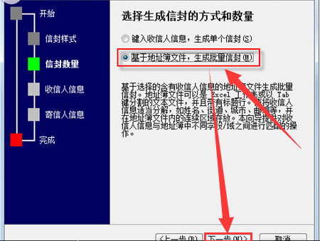 4、在“选择生成信封的方式和数量”页面,选中“基于地址簿文件,生成批量信封”单选按钮,然后单击【下一步】按钮。