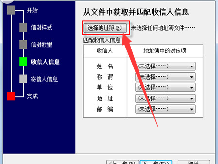5、在“从文件中获取并匹配收信人信息”页面中单击【选择地址簿】按钮。