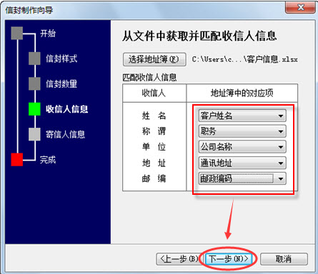 8、返回到“信封制作向导”对话框,单击“姓名”右侧的“未选择”下三角按钮,在随即打开的下拉列表中选择“客户姓名”选项。执行与上一步类似操作,将称谓、单位等其他选项与Excel表格中的对应项相匹配,再继续单击【下一步】按钮。