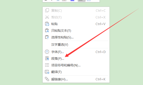 2、此时直接在wps空白处点击鼠标右键,然后在弹出的下拉菜单里直接点击【段落】选项。