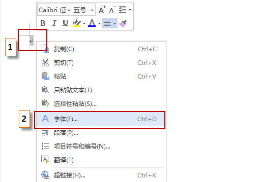 1、选中段落标记,点击右键-字体