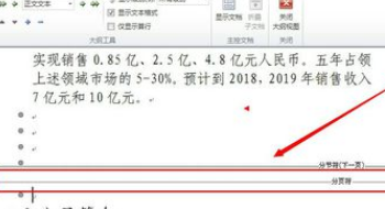 3、点击“大纲视图后”,在文档中找到分页符的位置。大纲视图的好处就是可以看到很多隐藏的符号。