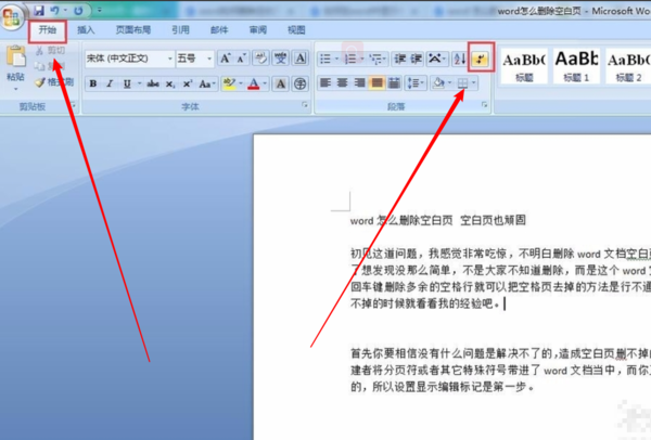 1、点击“开始”--->勾选“显示/隐藏段落标记”