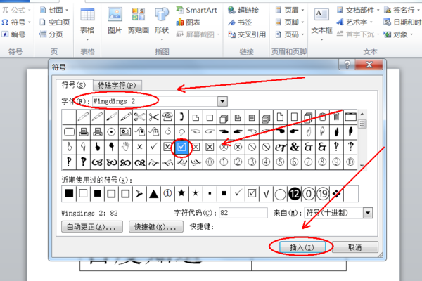 7.点选“Wingdings2”后,在窗口中可以找到√的符号,这时在点击它,最后插入即可。