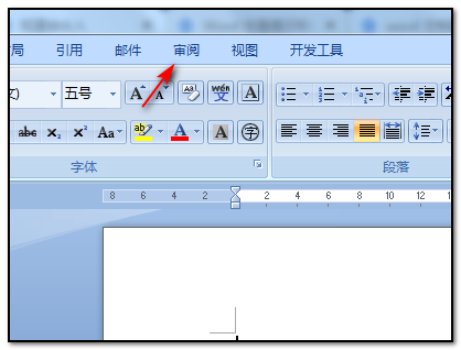 2、打开word2007软件以后,在工具栏的上方找到并点击“审阅”的功能;