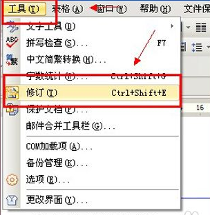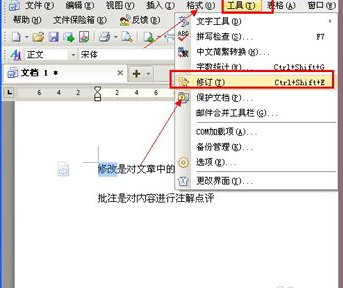 第二步:选择好前面两个字,在菜单栏找到工具,子啊显示的下拉栏里打开修订。