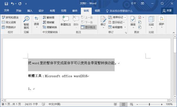 如果我们想把繁体字转换成简体字也是一样的额,选中需要转换的繁体字,同理,点击审阅——》繁转简,如图。