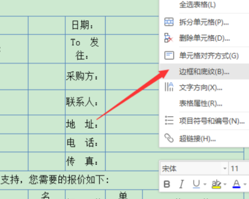 2、选中这个表格选在弹出的选择框里面点击边框和底纹进入。