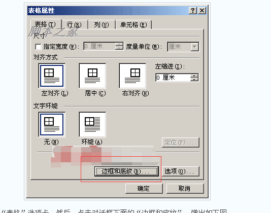 3 上图,选择“表格”选项卡,然后,点击对话框下面的“边框和底纹”,弹出如下图。