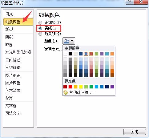 4、点击“线条颜色”选项,然后选择实线并选择对应的颜色,如图: