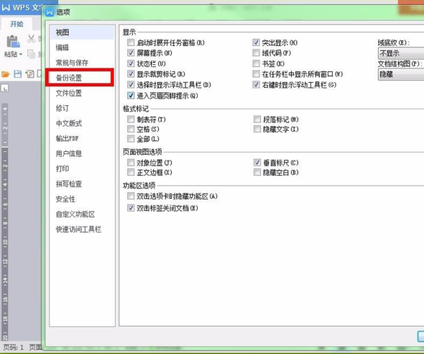 4.接着弹出选项的设置窗口,在左侧的列表中找到备份设置的名称,然后点击进入,如图所示: