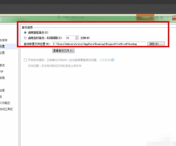 5.接着在右侧的窗口界面就出显示备份设置的一些选项,这里有两个选项,智能和定时备份,智能主要是在电脑或软件崩溃的时候自动备份的一个功能,下边的定时就更好理解了,隔几分钟就自动备份一次,不管什么情况,当然时间由自己设定,接着就是自动恢复文件的位置,这是自动保存的位置,都是可以更改的。