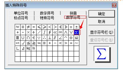 2、在出现的选项框中,单击“数学符号”,选中求和符号“∑”,双击或点击“确定”就行了。