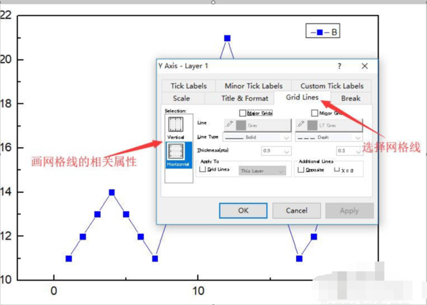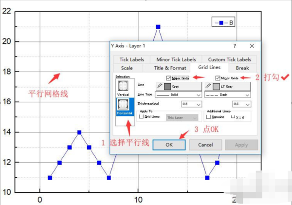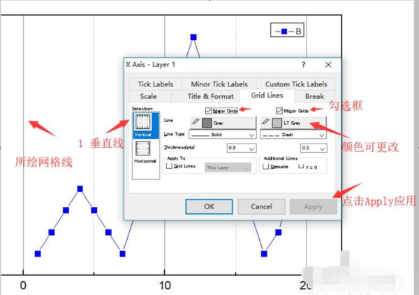5、先绘垂直网格线,按照图的标识进行操作,勾选框打勾后,可更改网格线的颜色。最后点Apply应用所选择的属性。