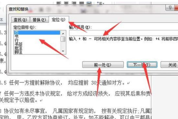 2、在替换选项点击第三个“定位”,然后在下面选择定位目标为“页”。如果页面比较多的话,可以在里面直接输入页号就可以了。如果页码少的话,用前一处和下一处选择页码就可以了。