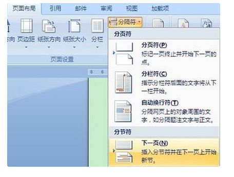 1、将光标放在要删除页的首部,单击页面布---->分隔符---->分节符---->下一节,如图所示;