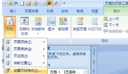 4、将光标放在下一页的页脚处,单击页眉和页脚工具设计----->页码----->设置页码格式;