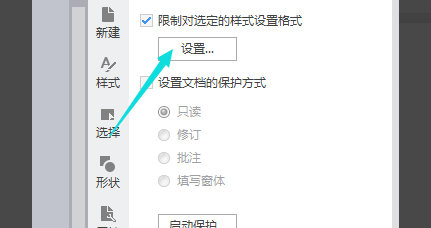 2.然后会在文档右侧出现设置选项,这里选择勾选“限制对选定的样式设置格式”,点击“设置”。