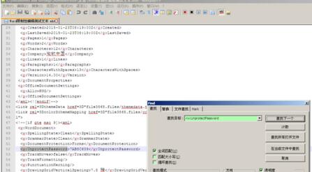 接着用记事本打开刚才的XML文档,点击”编辑“菜单下的”查找“命令,在打开的”查找对话框中输入“protection",查找方向选择”向下“,点击”查找按钮后,在查找到该关键词后,选择包含该关键词的当前整个标志,然后删除,最后保存文档。