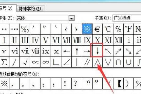 3、点击其他符号选项,在弹出的对话框内找到向下箭头,word编号后面的横的箭头就可以去掉了。