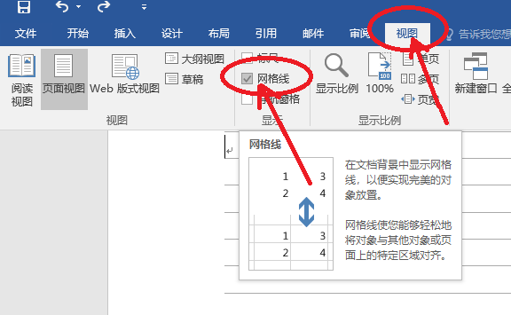3、Word文档是不显示的网格线的,但有时候因个别特殊情况下需显示网格线,方法如下图,在“视图”中勾选显示“网格线”即可。
