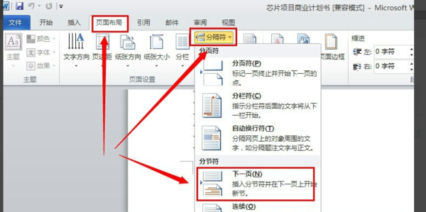 3,把章节之间插入分节符,“页面布局”--“分隔符”,如下图所示。