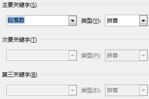 在弹出的排序文字对话框中,按图中红色框选依次选择“段落数”,“比划”,然后选择升序。