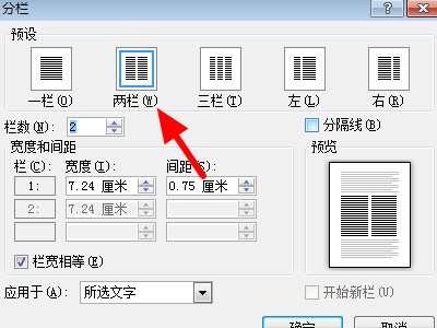 4、点击更多分栏以后,在弹出的对话框中选择两栏并勾选分隔线的命令;