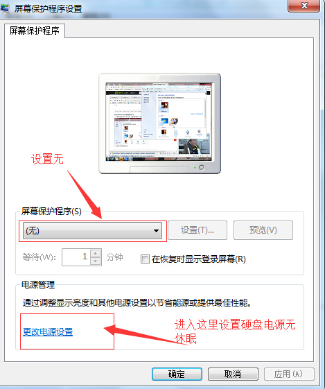 电脑关闭屏保和待机还有硬盘睡眠系统即可。