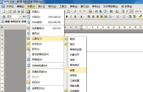 1、查看工具栏中有没有绘图工具栏,如果没有,可以在任何一个工具栏上右击鼠标,选择“绘图”选项,这时绘图工具栏就显示出来,如图所示: