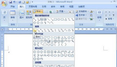 1、打开Word2007文档窗口,切换到“插入”功能区。在“插图”分组中单击“形状”按钮,在“形状”面板中的“线条”分类中可以看到多种线条类型,