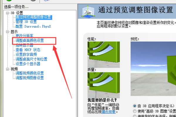 四、进入英伟达控制面板后,点击“调整桌面颜色设置”。