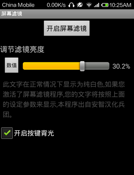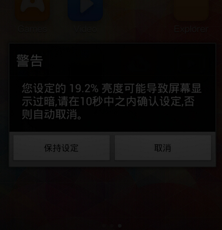 2、如果调的太低,会提示屏幕显示过暗,10秒不确定自动取消,比较人性化,通过截图可以看到,这个应用并不是通过降低亮度来实现的,而是在屏幕表面加加了一层黑色透明层,相对来说是光线不那么刺眼,还是有一定帮助的。
