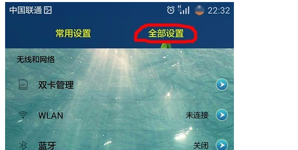 2这时,在出现的手机页面中,我们可以看到设置分为“常用设置”、“全部设置”,我们点击选择“全部设置”模块;