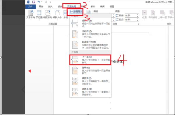 1、首先打开文档,将光标放到需要设置页码的位置,然后在页面布局里面选择分隔符里的下一页。