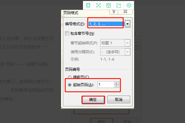 4、选择了之后,进入到页码格式设置页面,选择页码编号格式,并在页码编号下面选择起始页码,将数字改为1。确定就可以了。